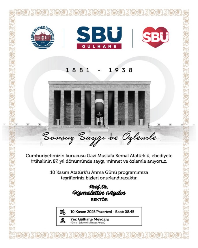 Üniversitemiz tarafından 10 Kasım 2025 saat 08:45'te Gülhane Meydanında 10 Kasım Atatürk'ü Anma Günü Programı gerçekleştirilecektir. Tüm öğrencilerimize, akademik ve idari personelimize duyurulur.