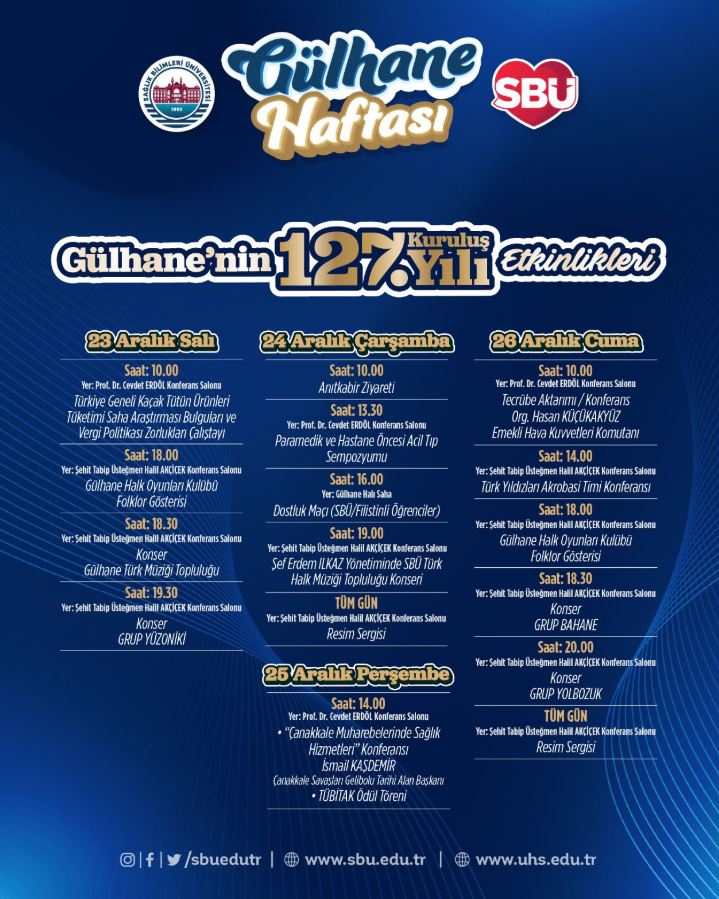 Üniversitemiz Gülhane Külliyesinde 23.12.2025-26.12.2025 tarihleri arasında Gülhane’nin Kuruluşunun 127. Yılı kapsamında ekte yer alan etkinlikler düzenlenecektir.